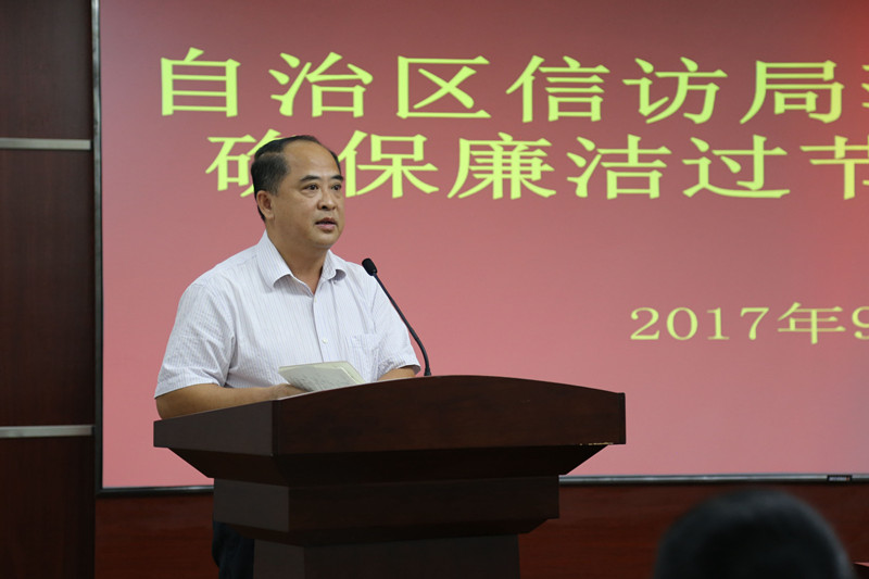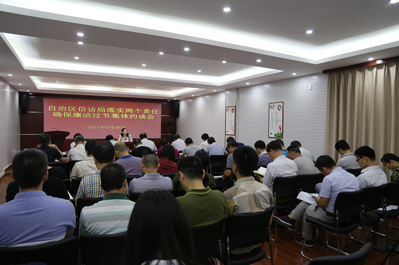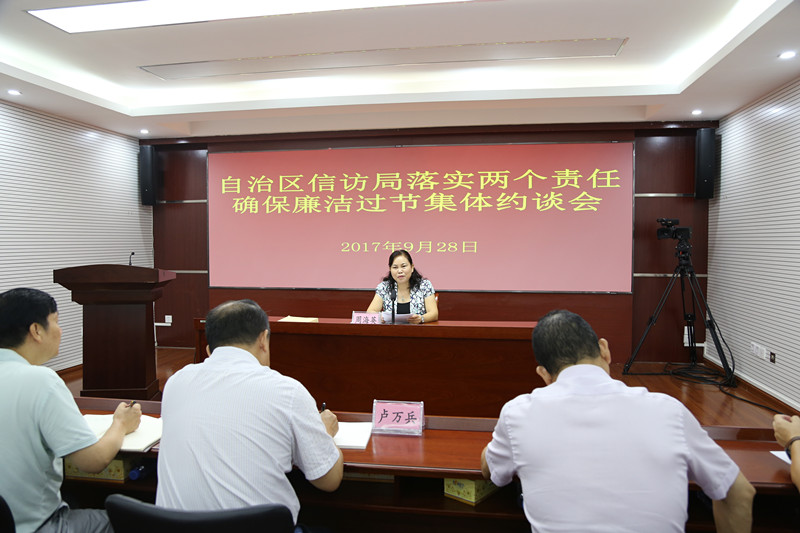 9月28日日上午,自治区纪委驻自治区党委办公厅纪检组组长周海英到自治区信访局对领导干部落实两个责任、确保廉洁过节进行集体约谈。自治区信访局班子领导、副厅级信访督查专员、副巡视员和全体党员参加约谈会。