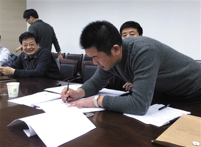 2月18日,国家信访局督查组会见信访人刘秀、刘海(均为化名)。在协调解决了拆迁补偿款等信访事项后,刘海在相关文件上签了字。新京报记者 吴为 摄