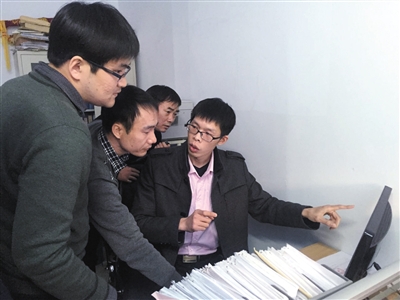 国家信访局督查组工作人员查看薛城区信访局的电脑,检查信访过程中是否有程序失当的问题。