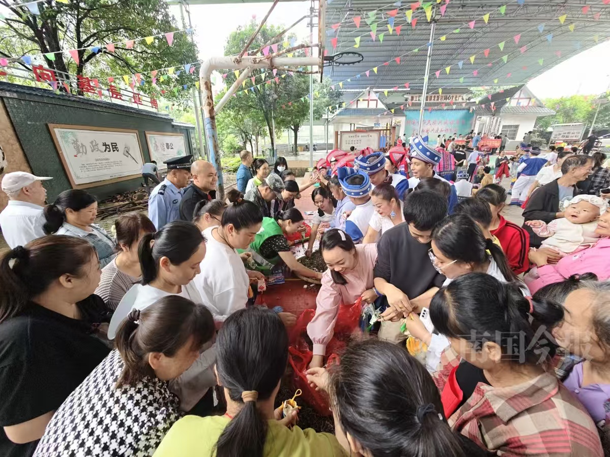 活动现场,歌舞《八桂大地》与客家山歌《进德是个好地方》交织出民族文化交响曲,马面裙秀《江南情》则演绎传统服饰与现代服饰结合的创新时尚。作为非遗传承人,曾令科在宣讲中动情表示:"我们像守护家传秘方般传承醒狮技艺,让客家文化在新时代焕发光彩。"活动还设置知识竞答、拔河、包粽子比赛等互动环节,200余位村民在香囊制作、竹竿舞和包粽子比赛中感受文化交融。
