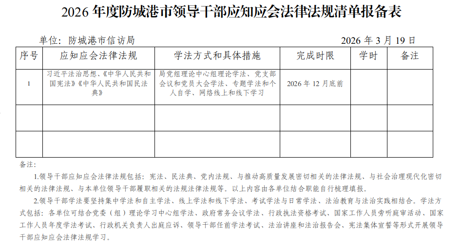2026年度防城港市领导干部应知应会法律法规清单报备表(市信访局).doc